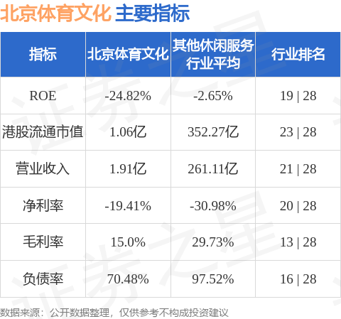 北京体育文化港股市值1.06亿港元,在其他休闲服务行业中排名第23。主要指标见下表: