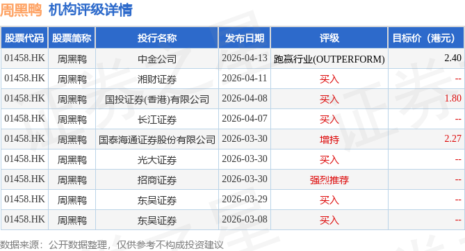 截至2026年4月17日收盘,周黑鸭(01458.HK)报收于1.58港元,下跌1.25%,成交量276.05万股,成交额430.35万港元。投行对该股的评级以买入为主,近90天内共有6家投行给出买入评级,近90天的目标均价为2.16港元。中金公司最新一份研报给予周黑鸭跑赢行业(OUTPERFORM)评级,目标价2.4港元。