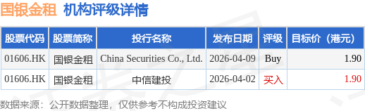 截至2026年4月17日收盘,国银金租(01606.HK)报收于1.54港元,上涨1.32%,成交量449.2万股,成交额690.65万港元。投行对该股的评级以买入为主,近90天内共有1家投行给出买入评级,近90天的目标均价为1.9港元。China Securities Co., Ltd.最新一份研报给予国银金租Buy评级,目标价1.9港元。
