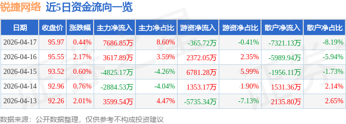 证券之星消息,截至2026年4月17日收盘,锐捷网络(301165)报收于95.97元,上涨0.44%,换手率1.17%,成交量9.29万手,成交额8.94亿元。