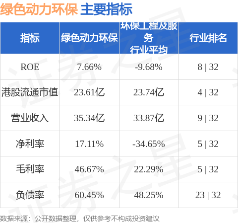绿色动力环保港股市值23.61亿港元,在环保工程及服务行业中排名第4。主要指标见下表: