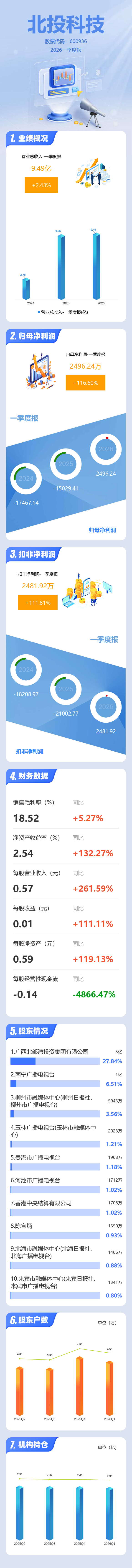 证券之星消息,北投科技2026年一季报显示,一季度公司主营收入9.49亿元,同比上升2.43%;归母净利润2496.24万元,同比上升116.61%;扣非净利润2481.92万元,同比上升111.82%;负债率63.47%,财务费用155.17万元,毛利率18.52%。