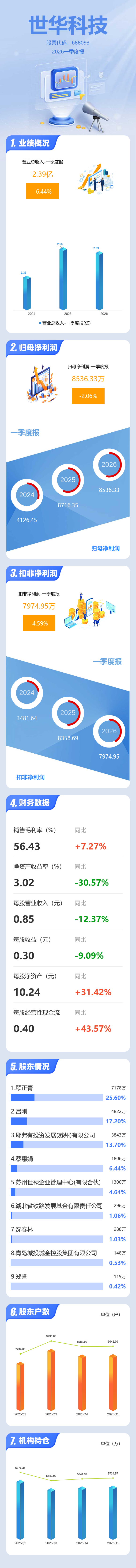 证券之星消息,世华科技2026年一季报显示,一季度公司主营收入2.39亿元,同比下降6.45%;归母净利润8536.33万元,同比下降2.07%;扣非净利润7974.95万元,同比下降4.59%;负债率4.0%,投资收益505.03万元,财务费用132.98万元,毛利率56.43%。