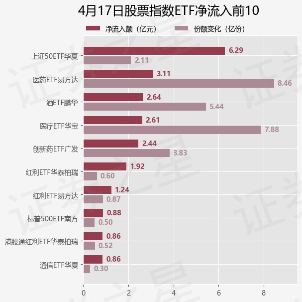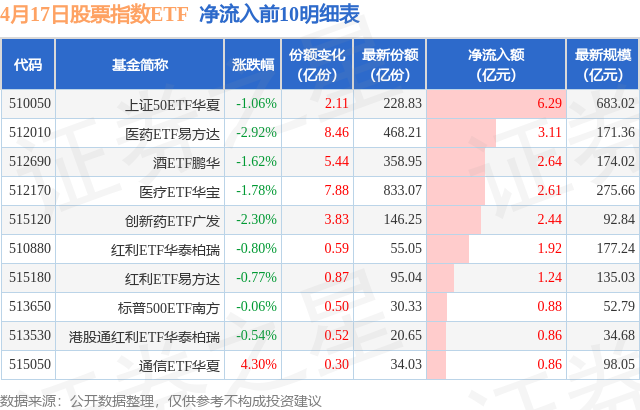 当日有133只股票指数ETF基金出现资金净流入,其中净流入排首位的是上证50ETF华夏(510050),份额增加了2.11亿份,净流入额为6.29亿元。