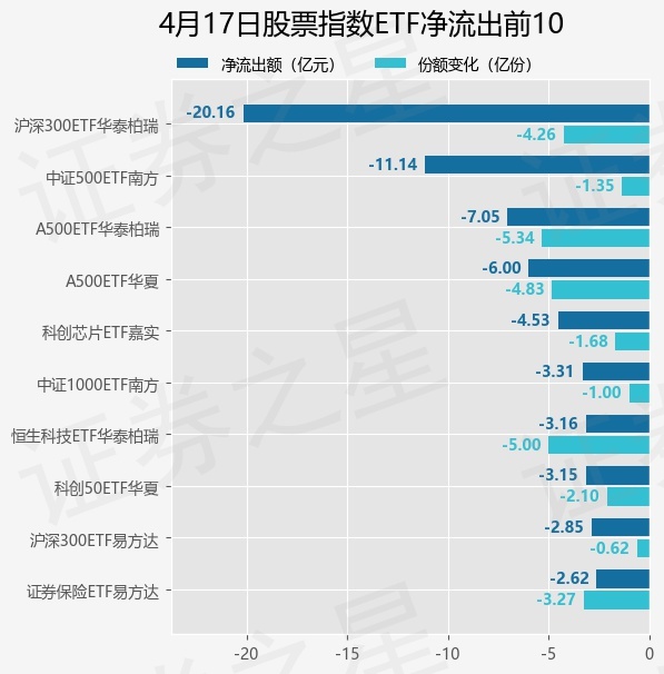 当日有293只股票指数ETF基金出现资金净流出,其中净流出排首位的是沪深300ETF华泰柏瑞(510300),份额减少了4.26亿份,净流出额为20.16亿元。