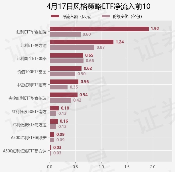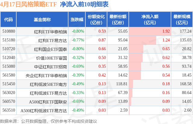 当日有15只风格策略ETF基金出现资金净流入,其中净流入排首位的是红利ETF华泰柏瑞(510880),份额增加了5950.0万份,净流入额为1.92亿元。