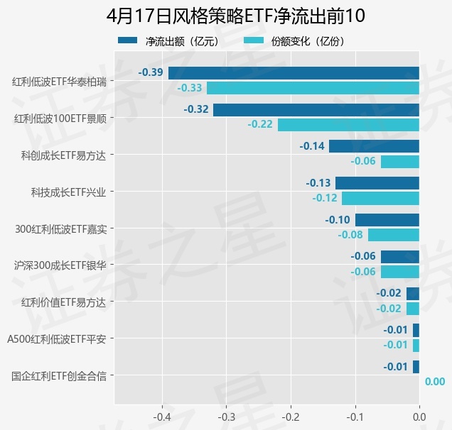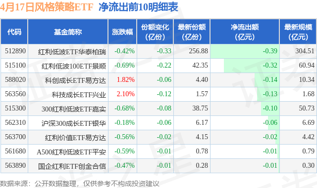 当日有9只风格策略ETF基金出现资金净流出,其中净流出排首位的是红利低波ETF华泰柏瑞(512890),份额减少了3300.0万份,净流出额为3912.9万元。