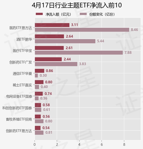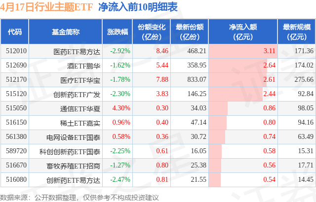 当日有77只行业主题ETF基金出现资金净流入,其中净流入排首位的是医药ETF易方达(512010),份额增加了8.46亿份,净流入额为3.11亿元。