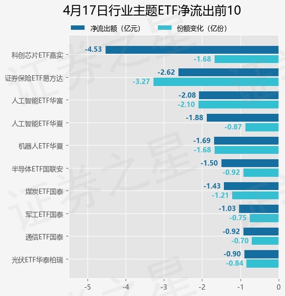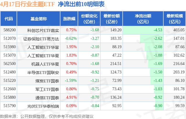 当日有166只行业主题ETF基金出现资金净流出,其中净流出排首位的是科创芯片ETF嘉实(588200),份额减少了1.68亿份,净流出额为4.53亿元。