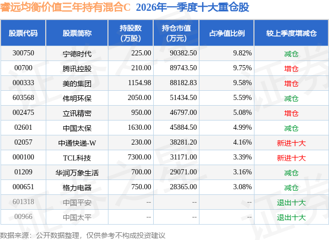 从基金规模来看,睿远均衡价值三年持有混合C基金2026年一季度公布的基金规模为9.4亿元,较上一期规模13.43亿元变化了-4.03亿元,环比变化了-29.97%。该基金最新一期资产配置为:股票占净值比90.67%,债券占净值比5.22%,现金占净值比1.56%。从基金持仓来看,该基金当季前十大股票仓位达58.6%,第一大重仓股为宁德时代(300750),持仓占比为9.82%。