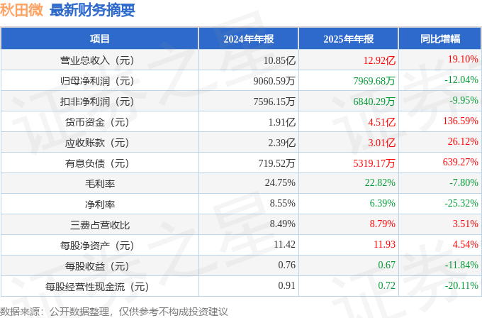 据证券之星公开数据整理,近期秋田微(300939)发布2025年年报。截至本报告期末,公司营业总收入12.92亿元,同比上升19.1%,归母净利润7969.68万元,同比下降12.04%。按单季度数据看,第四季度营业总收入3.17亿元,同比上升14.57%,第四季度归母净利润1596.51万元,同比下降8.74%。本报告期秋田微公司应收账款体量较大,当期应收账款占最新年报归母净利润比达377.57%。