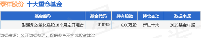 持有泰祥股份最多的基金为财通鼎欣量化选股18个月定开混合,目前规模为1.28亿元,最新净值1.2479(4月17日),较上一交易日下跌0.35%,近一年上涨22.04%。该基金现任基金经理为朱海东 郭欣。