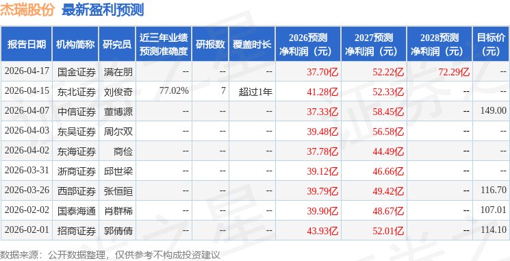证券之星数据中心根据近三年发布的研报数据计算,东北证券刘俊奇研究员团队对该股研究较为深入,近三年预测准确度均值为77.02%,其预测2026年度归属净利润为盈利41.28亿,根据现价换算的预测PE为30.07。