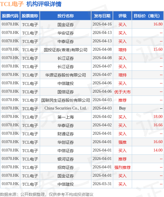 投行对该股的评级以买入为主,近90天内共有32家投行给出买入评级,近90天的目标均价为15.3港元。国金证券最新一份研报给予TCL电子买入评级,目标价16.8港元。
