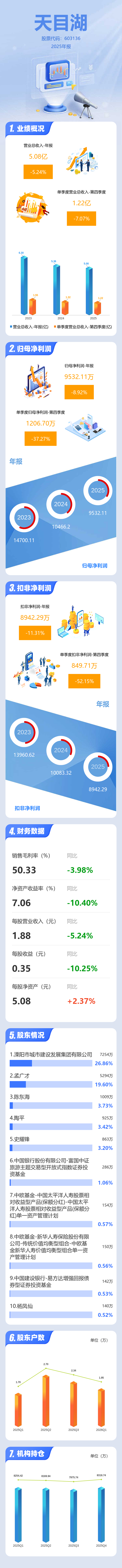 证券之星消息,天目湖2025年年报显示,当年度公司主营收入5.08亿元,同比下降5.25%;归母净利润9532.11万元,同比下降8.92%;扣非净利润8942.29万元,同比下降11.32%;其中2025年第四季度,公司单季度主营收入1.22亿元,同比下降7.07%;单季度归母净利润1206.7万元,同比下降37.27%;单季度扣非净利润849.71万元,同比下降52.16%;负债率11.92%,投资收益144.53万元,财务费用-633.41万元,毛利率50.33%。