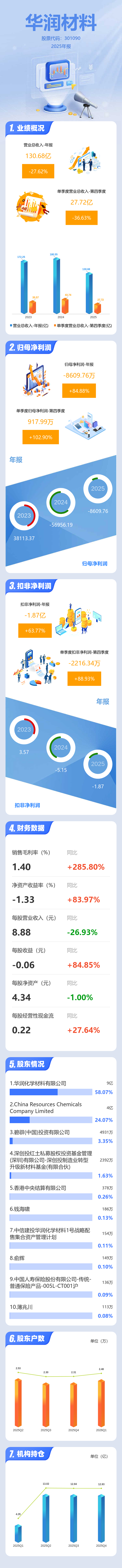证券之星消息,华润材料2025年年报显示,当年度公司主营收入130.68亿元,同比下降27.62%;归母净利润-8609.76万元,同比上升84.88%;扣非净利润-1.87亿元,同比上升63.77%;其中2025年第四季度,公司单季度主营收入27.72亿元,同比下降36.63%;单季度归母净利润917.99万元,同比上升102.9%;单季度扣非净利润-2216.34万元,同比上升88.93%;负债率23.3%,投资收益6817.01万元,财务费用-2830.02万元,毛利率1.4%。