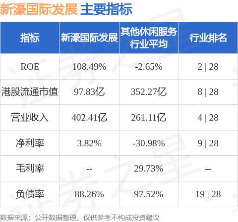 新濠国际发展港股市值97.83亿港元,在其他休闲服务行业中排名第8。主要指标见下表: