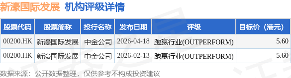 投行对该股的评级以跑赢行业(OUTPERFORM)为主,近90天内共有2家投行给出跑赢行业(OUTPERFORM)评级,近90天的目标均价为5.6港元。中金公司最新一份研报给予新濠国际发展跑赢行业(OUTPERFORM)评级,目标价5.6港元。