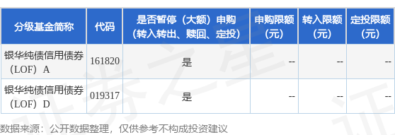 注:本公告就银华纯债信用主题债券型证券投资基金(LOF)(基金代码:A:161820;D:019317)的大额申购(含定期定额投资)业务进行限制,即自2026年4月20日(含2026年4月20日)起单日每个基金账户累计申购(含定期定额投资)银华纯债信用主题债券型证券投资基金(LOF)A类基金份额、D类基金份额的合计金额不超过1000万元,若超过1000万元,本基金管理人有权部分或全部拒绝银华纯债信用主题债券型证券投资基金(LOF)的申购(含定期定额投资)申请。如单日某基金账户单笔申购本基金的金额超过1000万元,本基金管理人有权确认该笔申购失败;如单日某基金账户多笔累计申购本基金的金额超过1000万元,本基金管理人将按申购金额大小排序,逐笔累加至符合不超过1000万元限额的申请确认成功,其余有权确认失败。针对单笔申购业务申请,仅有确认和不予确认两种处理方式,不存在对单笔申请的部分确认。敬请投资者留意。