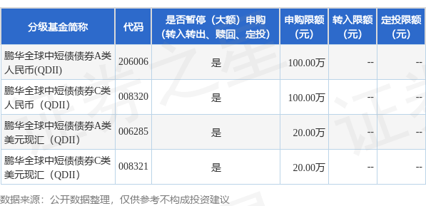 证券之星消息,4月20日鹏华基金管理有限公司发布《鹏华全球中短债债券型证券投资基金(QDII)调整大额申购和定期定额投资业务的公告》。公告中提示,为满足投资者的投资需求,自2026年4月21日起鹏华全球中短债债券型证券投资基金(QDII)调整大额申购和定期定额投资业务,下属分级基金调整明细如下: