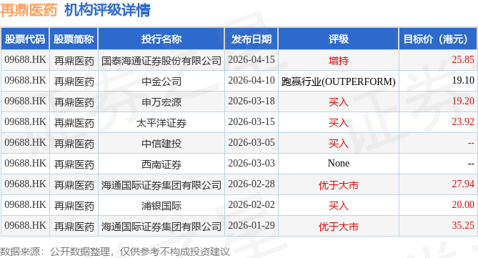 投行对该股的评级以买入为主,近90天内共有4家投行给出买入评级,近90天的目标均价为24.47港元。国泰海通证券股份有限公司最新一份研报给予再鼎医药增持评级,目标价25.85港元。