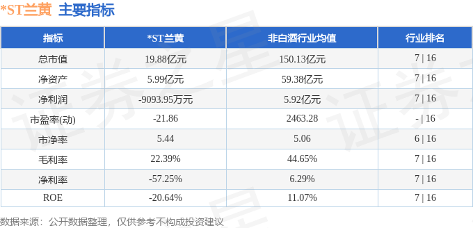 *ST兰黄主要指标及行业内排名如下: