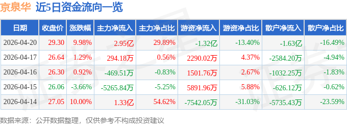 证券之星消息,京泉华4月20日涨停收盘,收盘价29.3元。该股于10点45分涨停,3次打开涨停,截止收盘封单资金为7446.44万元,占其流通市值1.1%。