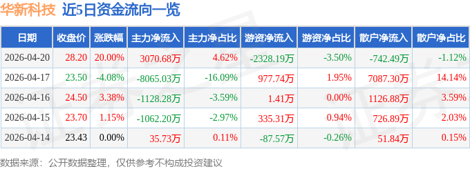 4月20日的资金流向数据方面,主力资金净流入3070.68万元,占总成交额4.62%,游资资金净流出2328.19万元,占总成交额3.5%,散户资金净流出742.49万元,占总成交额1.12%。