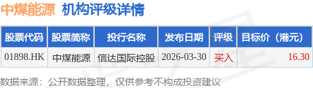 截至2026年4月20日收盘,中煤能源(01898.HK)报收于12.84港元,下跌4.11%,成交量4239.05万股,成交额5.49亿港元。投行对该股的评级以买入为主,近90天内共有1家投行给出买入评级,近90天的目标均价为16.3港元。信达国际控股最新一份研报给予中煤能源买入评级,目标价16.3港元。