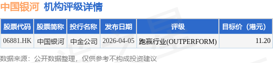 截至2026年4月20日收盘,中国银河(06881.HK)报收于8.7港元,上涨0.35%,成交量1637.9万股,成交额1.42亿港元。投行对该股的评级以跑赢行业(OUTPERFORM)为主,近90天内共有1家投行给出跑赢行业(OUTPERFORM)评级,近90天的目标均价为11.2港元。中金公司最新一份研报给予中国银河跑赢行业(OUTPERFORM)评级,目标价11.2港元。