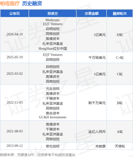 证券之星消息,根据天眼查APP于4月19日公布的信息整理,无锡帕母医疗技术有限公司D轮融资,融资额1亿美元,参与投资的机构包括Medtronic,EQT Ventures,启明创投,高榕创投,奥博资本,礼来亚洲基金,HongShan红杉中国。