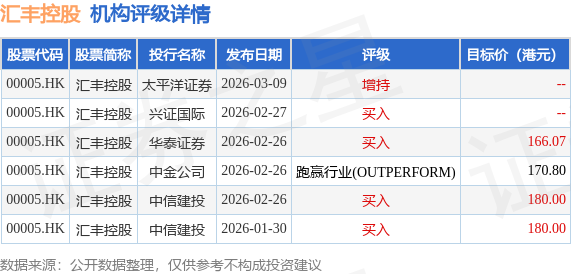 截至2026年4月20日收盘,汇丰控股(00005.HK)报收于142.2港元,上涨0.49%,成交量1386.31万股,成交额19.71亿港元。投行对该股的评级以买入为主,近90天内共有4家投行给出买入评级,近90天的目标均价为174.22港元。太平洋证券最新一份研报给予汇丰控股增持评级。