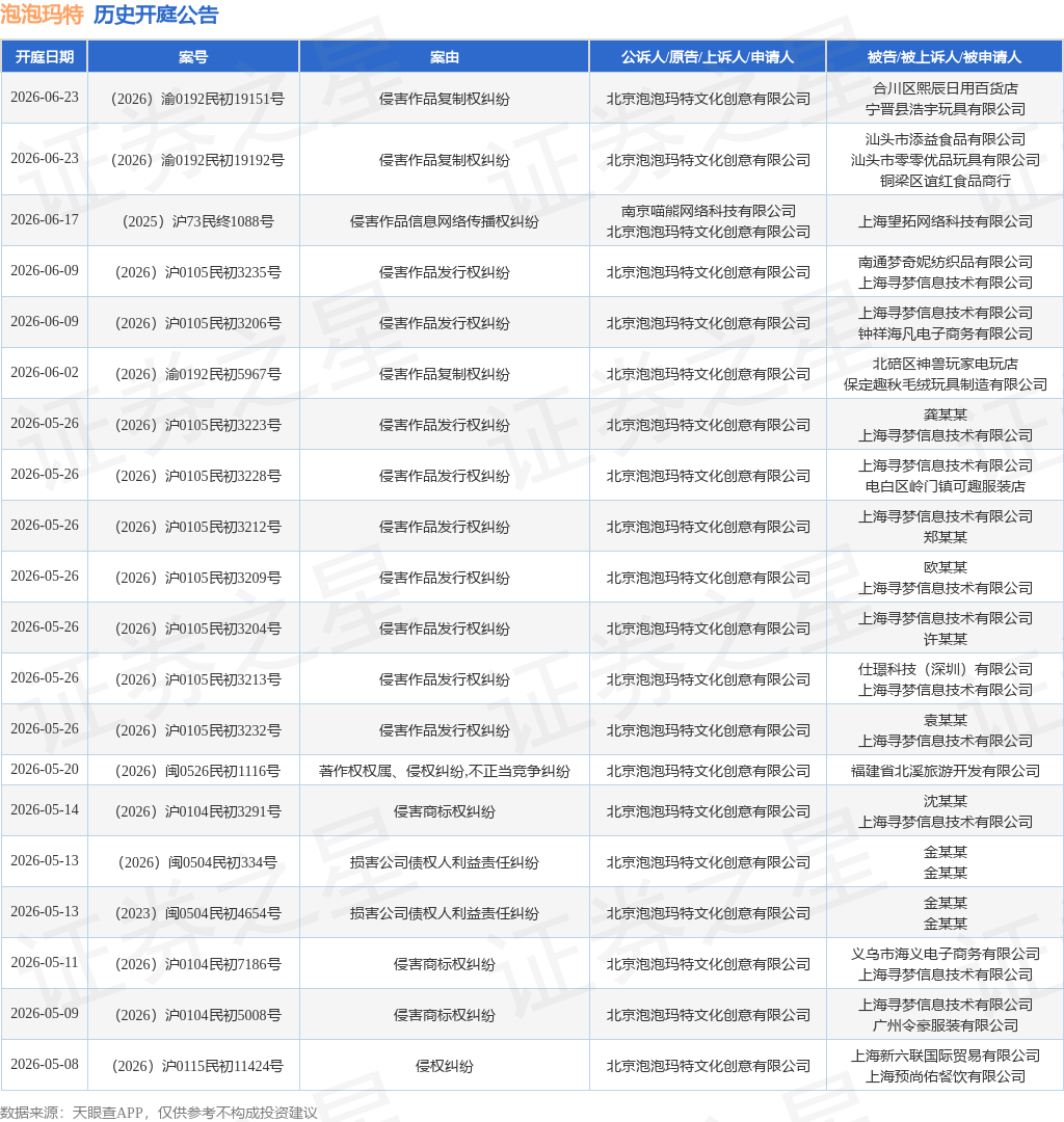案号:(2026)浙0783刑初351号根据统计,近一年内以北京泡泡玛特文化创意有限公司为当事人的历史开庭公告有156则,其中案由为“著作权权属、侵权纠纷”的公告以42则居首,其次为“侵害商标权纠纷”有33则,“侵害作品复制权纠纷”有22则。历史开庭公告(前20条)如下: