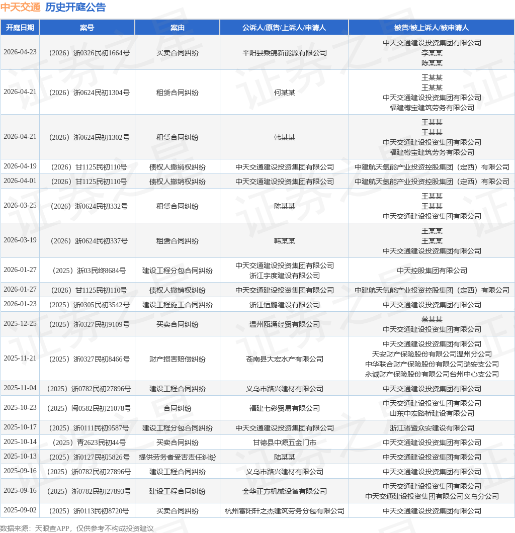 案号:(2026)浙0326民初1664号根据统计,近一年内以中天交通建设投资集团有限公司为当事人的历史开庭公告有35则,其中案由为“买卖合同纠纷”的公告以9则居首,其次为“租赁合同纠纷”有5则,“建设工程分包合同纠纷”有4则。历史开庭公告(前20条)如下: