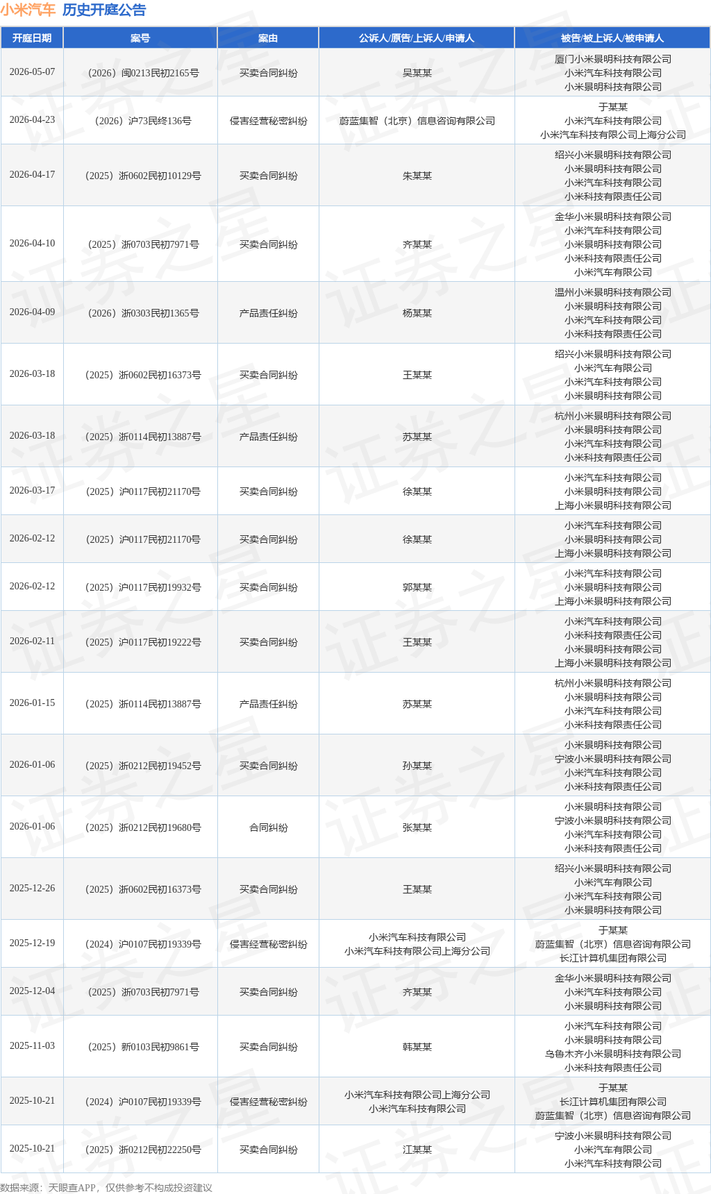 案号:(2026)沪73民终136号根据统计,近一年内以小米汽车科技有限公司为当事人的历史开庭公告有28则,其中案由为“买卖合同纠纷”的公告以18则居首,其次为“侵害经营秘密纠纷”有5则,“产品责任纠纷”有3则。历史开庭公告(前20条)如下: