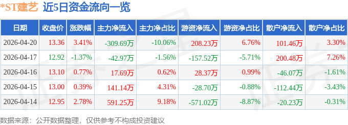 证券之星消息,截至2026年4月20日收盘,*ST建艺(002789)报收于13.36元,上涨3.41%,换手率1.5%,成交量2.34万手,成交额3078.3万元。