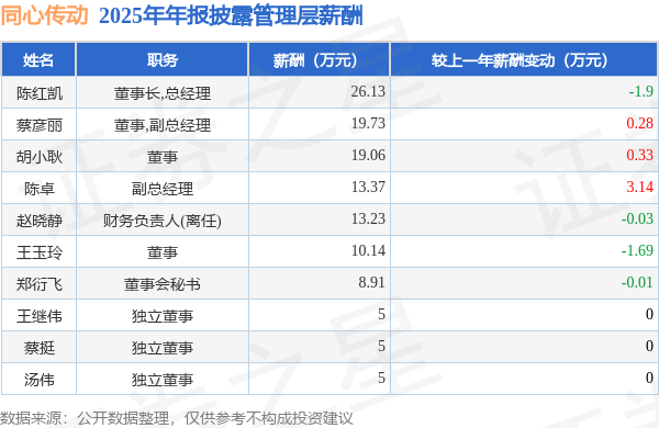 证券之星消息,同心传动发布2025年年报,数据显示:公司主营收入1.51亿元,同比增12.99%。归母净利润为2724.79万元,同比增18.96%。扣非净利润为2302.83万元,同比增15.72%。当年公司员工总数183人,同比增0.55%。人均薪酬8.41万元(注:"人均薪酬"根据定期报告中"应付职工薪酬"附注的本期增加值 / 员工总数计算而来),同比减0.3%。人均创收82.27万元,同比增12.37%。人均创利14.67万元,同比增16.54%。其中管理层薪酬总额为125.57万元,同比上一年减20.38%,薪酬最高的为董事长,总经理陈红凯,薪酬26.13万元。