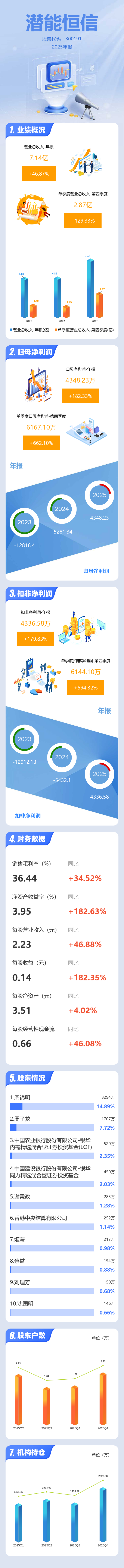 证券之星消息,潜能恒信2025年年报显示,当年度公司主营收入7.14亿元,同比上升46.88%;归母净利润4348.23万元,同比上升182.33%;扣非净利润4336.58万元,同比上升179.83%;其中2025年第四季度,公司单季度主营收入2.87亿元,同比上升129.34%;单季度归母净利润6167.1万元,同比上升662.1%;单季度扣非净利润6144.1万元,同比上升594.32%;负债率72.89%,投资收益830.66万元,财务费用5827.3万元,毛利率36.44%。