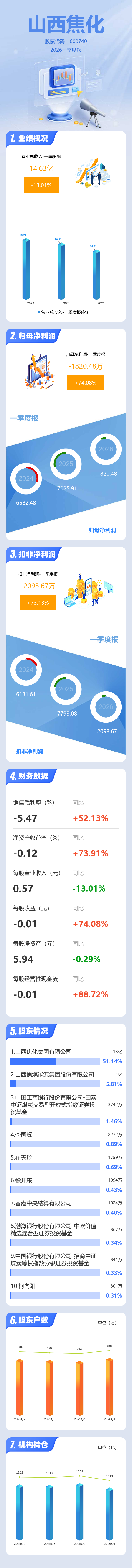 证券之星消息,山西焦化2026年一季报显示,一季度公司主营收入14.63亿元,同比下降13.01%;归母净利润-1820.48万元,同比上升74.09%;扣非净利润-2093.67万元,同比上升73.13%;负债率40.09%,投资收益2.39亿元,财务费用5579.3万元,毛利率-5.47%。