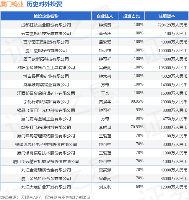 证券之星消息,根据天眼查APP显示,厦门钨业(600549.SH)新增一起对外投资事件,被投资公司为成都虹波实业股份有限公司,法定代表人钟炳贤,投资占比为100%。该公司从事通用设备制造业,注册资本为7204.29万人民币。目前,厦门钨业共存在对外投资46项,投资占比前20的项目见下表: