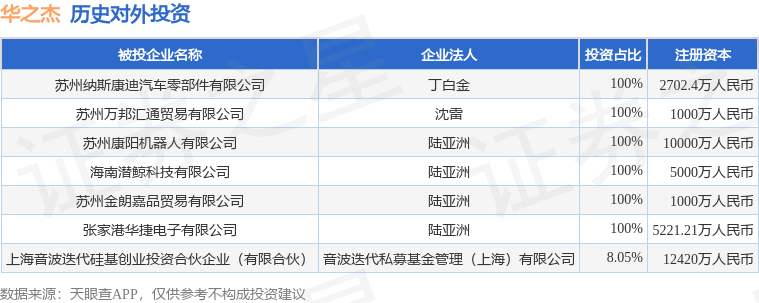 证券之星消息,根据天眼查APP显示,华之杰(603400.SH)新增一起对外投资事件,被投资公司为苏州纳斯康迪汽车零部件有限公司,法定代表人丁白金,投资占比为100%。该公司从事汽车制造业,注册资本为2702.4万人民币。目前,华之杰共存在对外投资7项,详见下表: