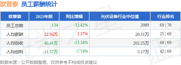 证券之星消息,4月20日欧普泰公布2025年年报,当年营收6219.08万元,同比减24.1%;净利润为-1550.89万元,同比增5.64%。根据财报数据披露,当年公司员工总数134人,同比减12.42%;人均薪酬22.94万元,同比增1.37%;人均创收46.41万元,同比减13.34%;公司员工薪酬统计见下表: