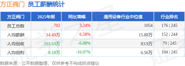证券之星消息,4月20日方正阀门公布2025年年报,当年营收7.27亿元,同比减3.86%;净利润为5744.73万元,同比减13.35%。根据财报数据披露,当年公司员工总数702人,同比增3.24%;人均薪酬14.49万元,同比增6.58%;人均创收103.53万元,同比减6.88%;人均创利8.18万元,同比减16.07%;公司员工薪酬统计见下表: