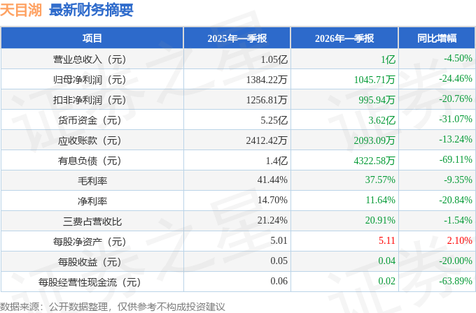 据证券之星公开数据整理,近期天目湖(603136)发布2026年一季报。根据财报显示,天目湖净利润同比下降24.46%。截至本报告期末,公司营业总收入1.0亿元,同比下降4.5%,归母净利润1045.71万元,同比下降24.46%。按单季度数据看,第一季度营业总收入1.0亿元,同比下降4.5%,第一季度归母净利润1045.71万元,同比下降24.46%。