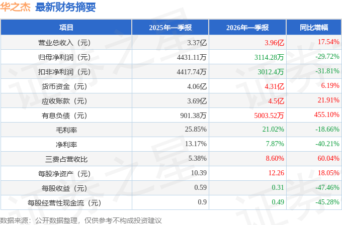 据证券之星公开数据整理,近期华之杰(603400)发布2026年一季报。截至本报告期末,公司营业总收入3.96亿元,同比上升17.54%,归母净利润3114.28万元,同比下降29.72%。按单季度数据看,第一季度营业总收入3.96亿元,同比上升17.54%,第一季度归母净利润3114.28万元,同比下降29.72%。本报告期华之杰公司应收账款体量较大,当期应收账款占最新年报归母净利润比达361.83%。