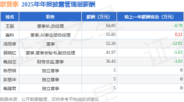 证券之星消息,欧普泰发布2025年年报,数据显示:公司主营收入6219.08万元,同比减24.1%。归母净利润为-1550.89万元,同比增5.64%。扣非净利润为-1738.64万元,同比增10.84%。当年公司员工总数134人,同比减12.42%。人均薪酬22.94万元(注:"人均薪酬"根据定期报告中"应付职工薪酬"附注的本期增加值 / 员工总数计算而来),同比增1.37%。人均创收46.41万元,同比减13.34%。其中管理层薪酬总额为266.36万元,同比上一年减38.83%,薪酬最高的为董事长,总经理王振,薪酬64.85万元。