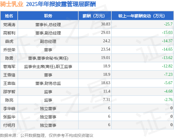证券之星消息,骑士乳业发布2025年年报,数据显示:公司主营收入13.19亿元,同比增1.75%。归母净利润为4901.47万元,同比增736.96%。扣非净利润为6045.0万元,同比增54.34%。当年公司员工总数1003人,同比减9.23%。人均薪酬12.18万元(注:"人均薪酬"根据定期报告中"应付职工薪酬"附注的本期增加值 / 员工总数计算而来),同比增6.74%。人均创收131.55万元,同比增12.09%。人均创利4.19万元,同比增557.36%。其中管理层薪酬总额为219.75万元,同比上一年减34.65%,薪酬最高的为董事长,总经理党涌涛,薪酬30.83万元。