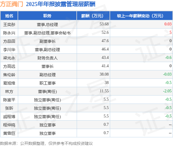 证券之星消息,方正阀门发布2025年年报,数据显示:公司主营收入7.27亿元,同比减3.86%。归母净利润为5744.73万元,同比减13.35%。扣非净利润为4369.81万元,同比减34.62%。当年公司员工总数702人,同比增3.24%。人均薪酬14.49万元(注:"人均薪酬"根据定期报告中"应付职工薪酬"附注的本期增加值 / 员工总数计算而来),同比增6.58%。人均创收103.53万元,同比减6.88%。人均创利8.18万元,同比减16.07%。其中管理层薪酬总额为390.61万元,同比上一年减11.85%,薪酬最高的为董事,总经理王奕彤,薪酬53.68万元。