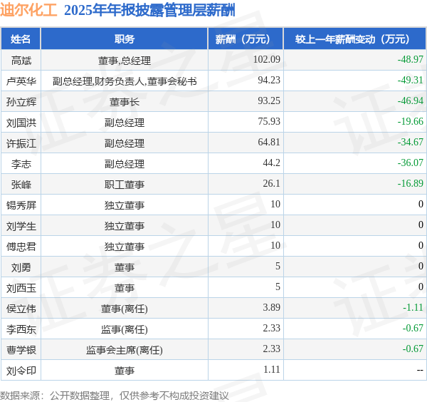 证券之星消息,迪尔化工发布2025年年报,数据显示:公司主营收入7.26亿元,同比减7.21%。归母净利润为5840.79万元,同比减32.21%。扣非净利润为5081.41万元,同比减40.14%。当年公司员工总数417人,同比增21.93%。人均薪酬14.73万元(注:"人均薪酬"根据定期报告中"应付职工薪酬"附注的本期增加值 / 员工总数计算而来),同比减30.15%。人均创收174.1万元,同比减23.9%。人均创利13.99万元,同比减44.26%。其中管理层薪酬总额为550.27万元,同比上一年减31.57%,薪酬最高的为董事,总经理高斌,薪酬102.09万元。