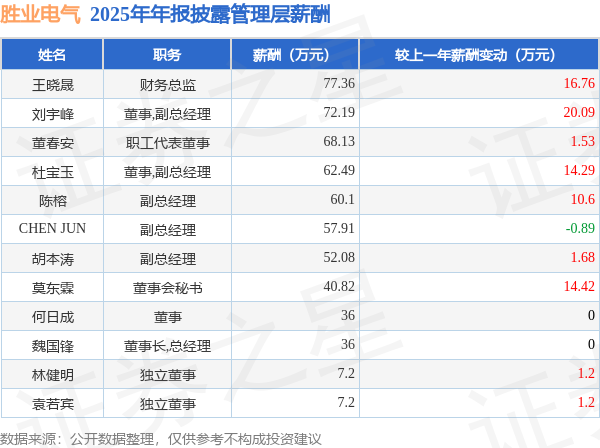 证券之星消息,胜业电气发布2025年年报,数据显示:公司主营收入5.51亿元,同比减13.05%。归母净利润为1861.61万元,同比减61.19%。扣非净利润为1642.34万元,同比减64.99%。当年公司员工总数894人,同比减1.43%。人均薪酬11.12万元(注:"人均薪酬"根据定期报告中"应付职工薪酬"附注的本期增加值 / 员工总数计算而来),同比增3.5%。人均创收61.66万元,同比减11.78%。人均创利2.08万元,同比减60.63%。其中管理层薪酬总额为577.48万元,同比上一年增3.77%,薪酬最高的为财务总监王晓晟,薪酬77.36万元。